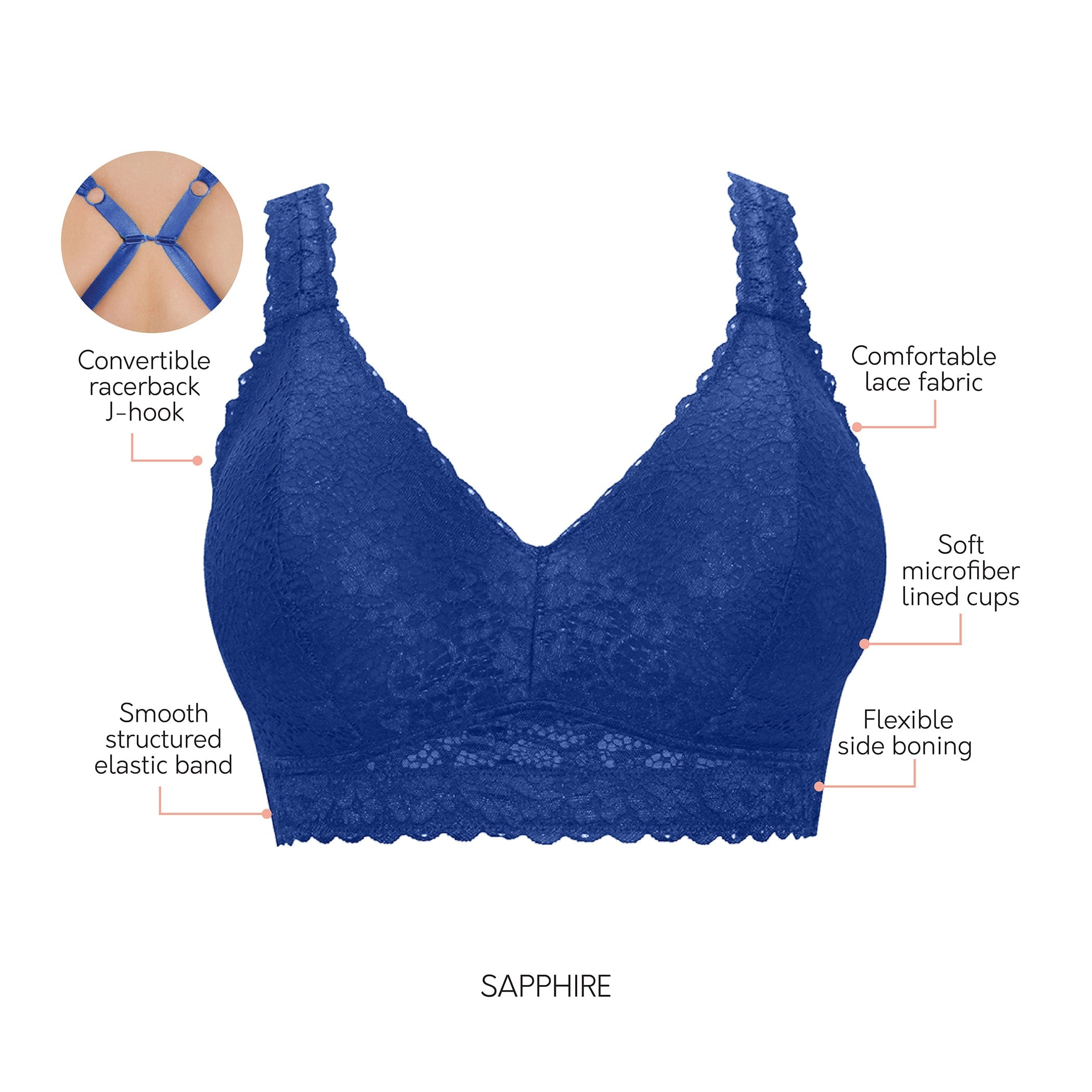 Pretty and lacy, this wire-free bralette is very supportive and super comfortable. The convertible J-hook feature allows for a racerback option. Specially designed for full busted and full figure women. Inclusive sizing and a wide variety of colors available.