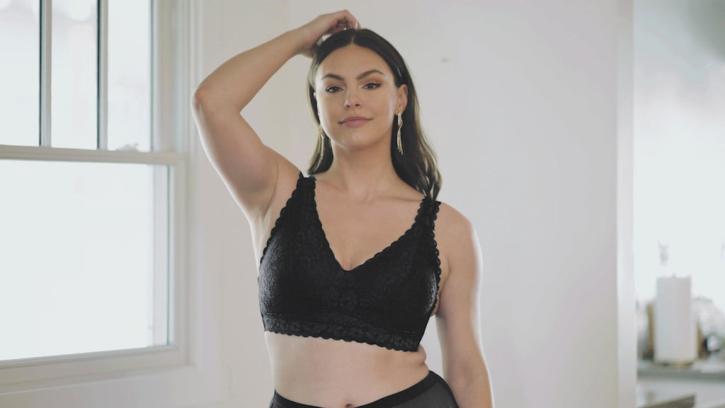 Pretty and lacy, this wire-free bralette is very supportive and super comfortable. The convertible J-hook feature allows for a racerback option. Specially designed for full busted and full figure women. Inclusive sizing and a wide variety of colors available.