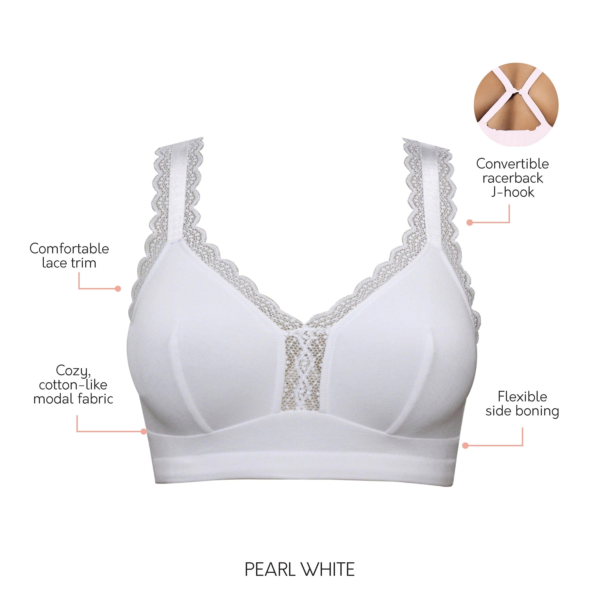 Our softest and most comfortable wire-free bra ever! Our wire-free bralette features a super soft and cozy breathable cotton-like modal fabric, accented with a pretty lace trim. This comfy, yet supportive bralette is perfect for lounging or as a sleep bra.