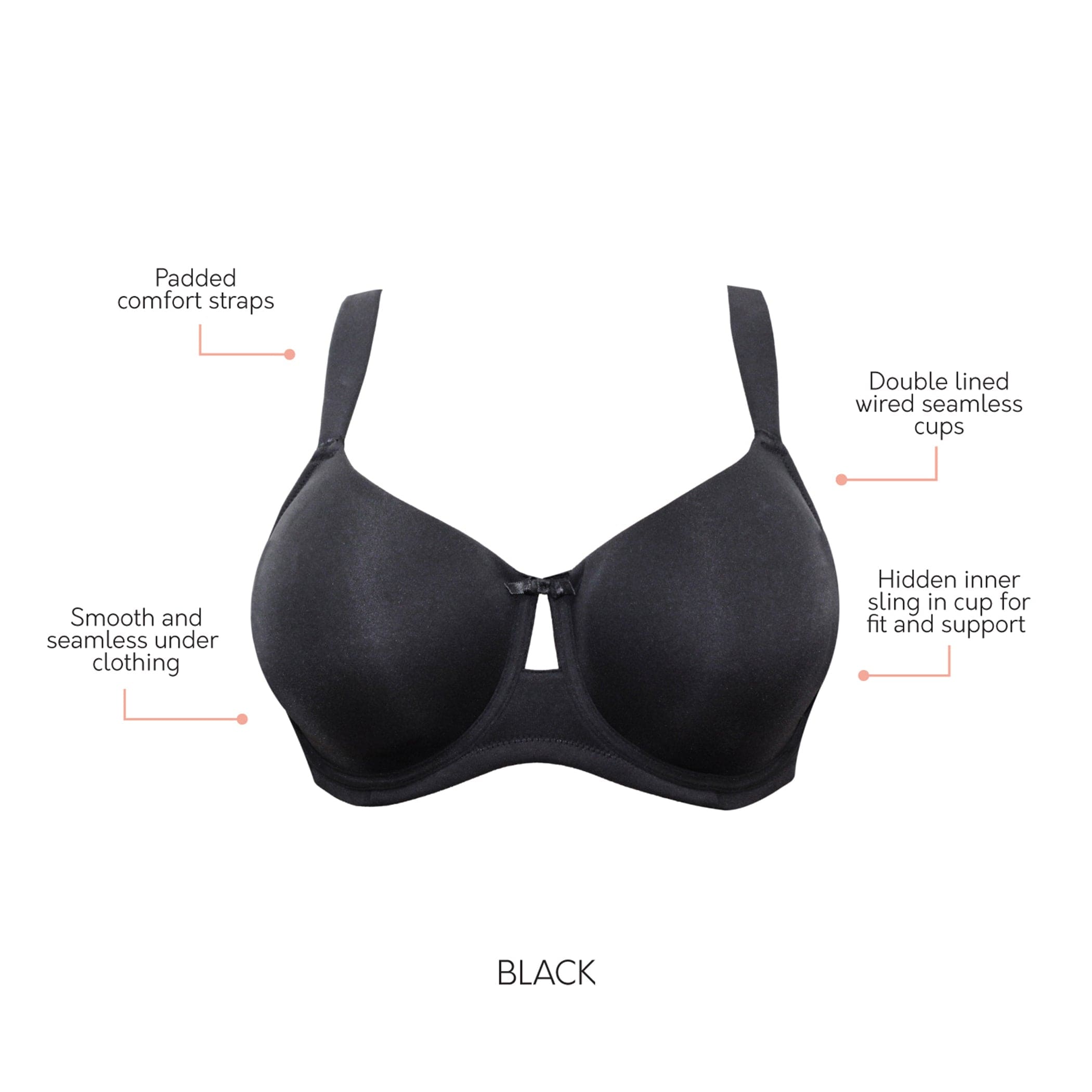 This everyday T-shirt bra is a staple in every wardrobe. The seamless full coverage, double lined wired cups flatter your bust while feeling comfortable. The extra padded straps and inner side slings provide the ultimate comfort and support