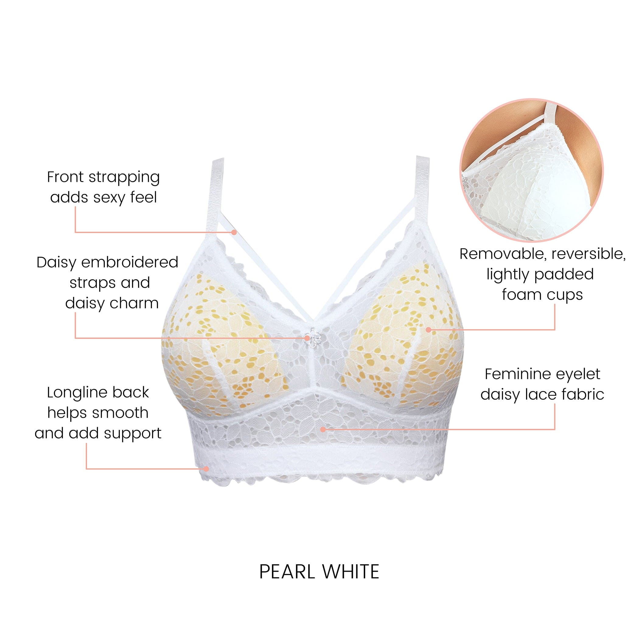 Our on trend Daisy Wire Free Lace Bralette- the perfect blend of sweet meets sexy, featuring eyelet daisy lace and embroidered straps. A must have for your inner wear outerwear bra wardrobe for all full busted and full figured women. Based on our Mia Longline Bra silhouette, Daisy includes removable and reversible lightly padded cups for versatility of support and color. The longline back helps smooth and add support while front strapping adds a sexy look and feel. Inclusive sizing available.