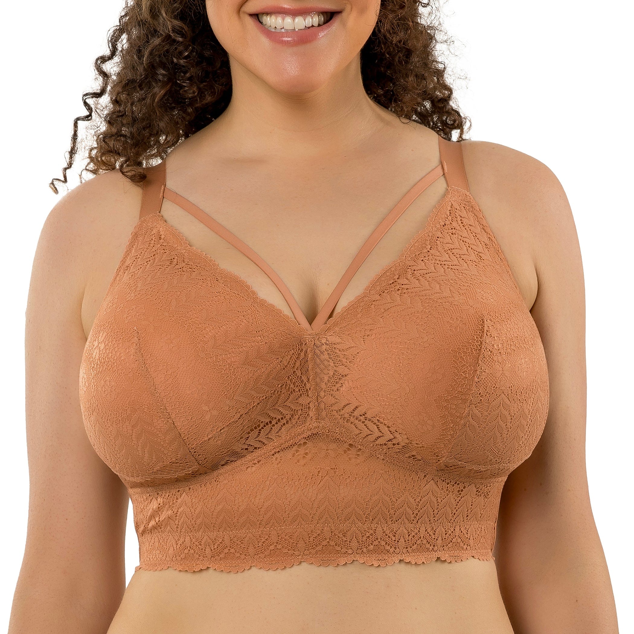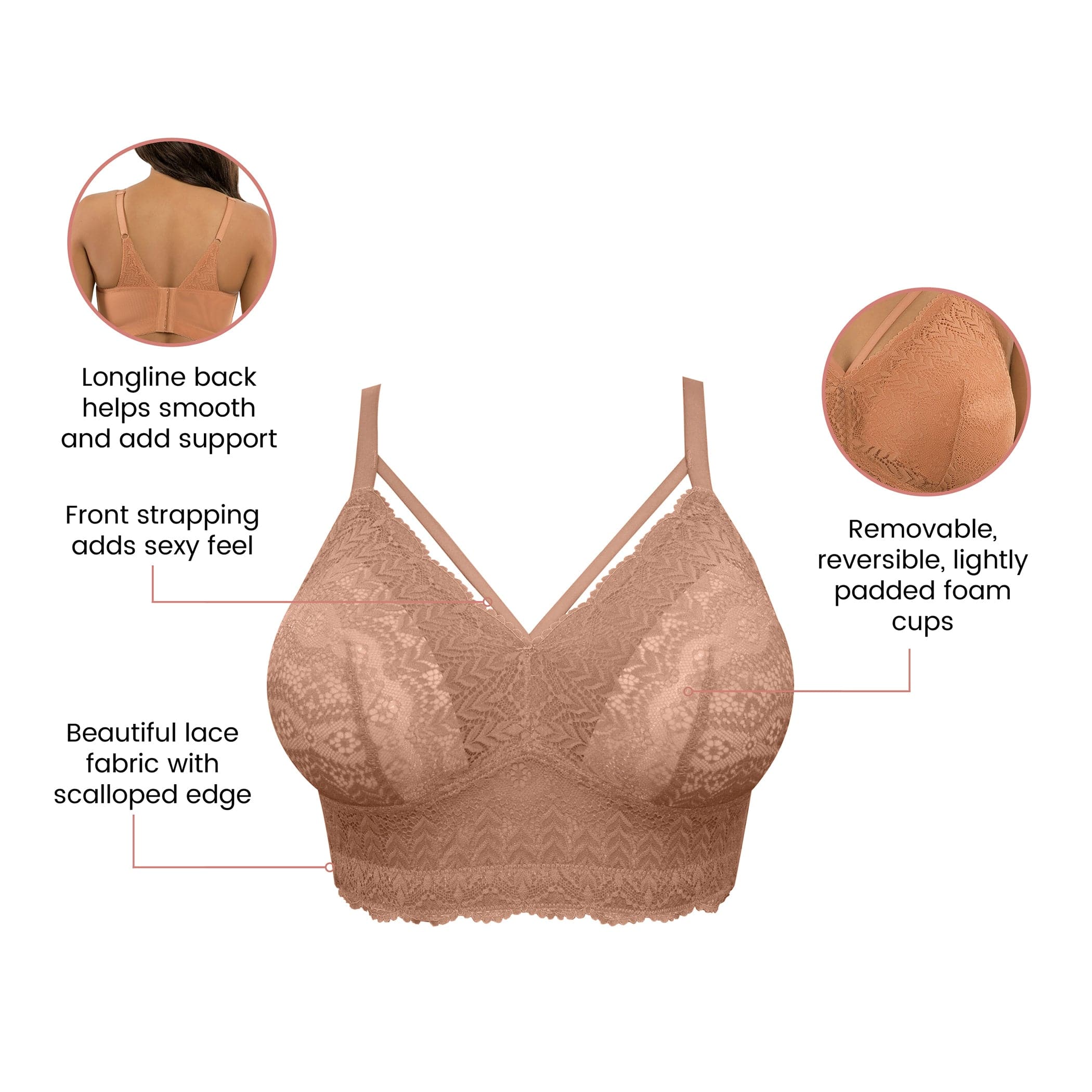 This sexy lace bralette features a wire-free design with removable and reversable lightly padded foam cups. The front straps add an eye catching appeal with multiple hook and eye back closure